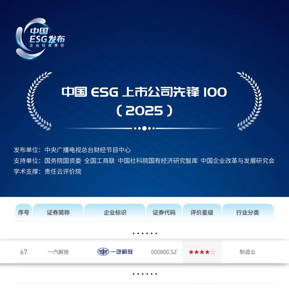 10月24日,由中央广播电视总台与国务院国资委、全国工商联、中国社科院、中国企业改革与发展研究会等机构联合举办的“ESG中国·创新年会暨首届ESG国际博览会”在北京开幕。活动现场“中国ESG上市公司先锋100”榜单正式揭晓。一汽解放(000800)凭借在ESG领域的卓越表现,连续三年成功入选,位列商用车行业第一。